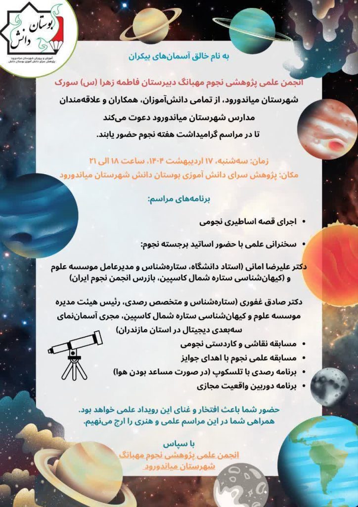 مراسمی با هدف آموزش و ترویج نجوم توسط انجمن مهبانگ دبیرستان حضرت فاطمه زهرا (س) سورک میاندورود با حضور ارزشمند دکتر امانی بازرس انجمن نجوم کشور و دکتر غفوری متخصص آموزش مفاهیم کیهان شناسی در پژوهش سرای دانش آموزی بوستان دانش برگزار شد.